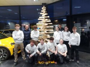 Les élèves de 2nde Bac Pro Menuiserie réalisent régulièrement des ouvrages concrets destinés à des partenaires locaux. Parmi ces réalisations : de majestueux sapins de Noël de 3 mètres, entièrement conçus et fabriqués dans l’atelier du lycée.